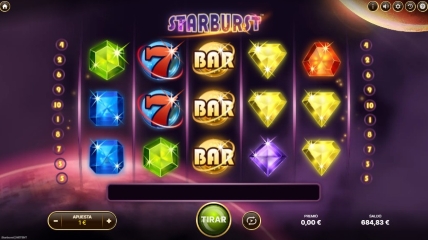 Starburst es una slot creada por NetEnt con un diseño de estilo arcade que atrae a numerosos jugadores. Esta tragamonedas te lleva hasta el espacio exterior y cuenta con un formato de cinco carretes, tres filas y diez líneas de pago.